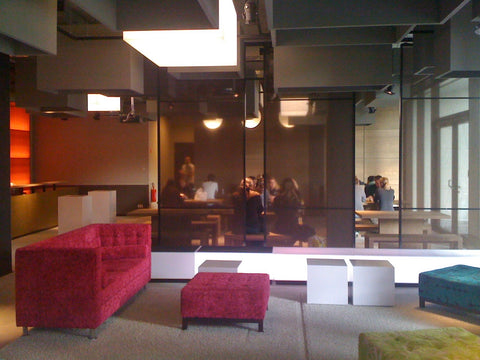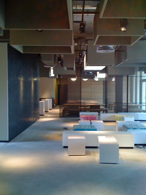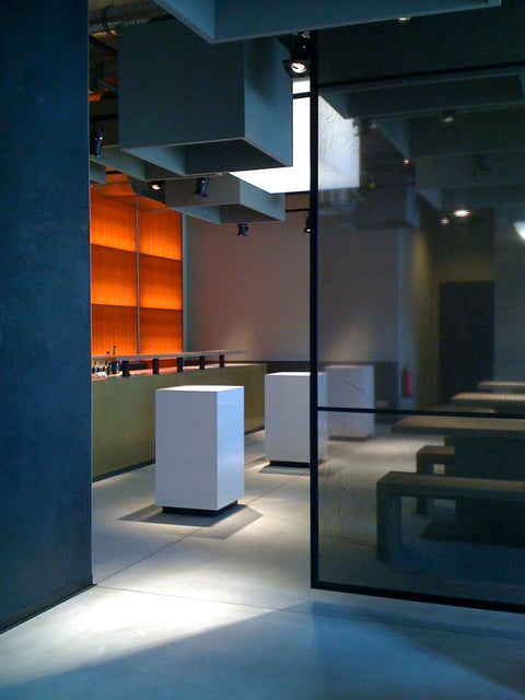 Coole, minimalistische Eleganz trifft hier auf clubbige Bar-Atmosphäre und eine luftig-freie Architektursprache. Geschaffen wurde hier ein für die damalige Zeit sehr außergewöhnlicher, multifunktionaler Lifestyle-Work-And-Meeting-Space, der gastronomisch oder als Office genutzt werden kann und mit verschiedenen Stilen spielt. New Romanticism meets Industrial Style. Die Wirkung ist noch heute: erstaunlich zeitlos.